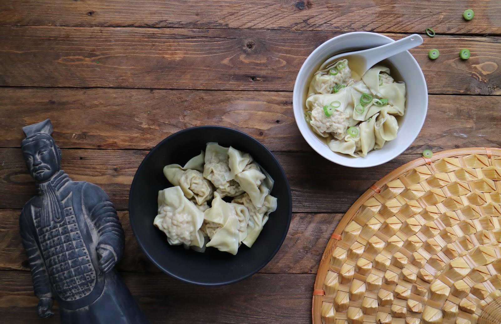Servimos. Colamos el caldo. Echamos 6 o 7 wonton por persona en un bol o plato hondo. Cubrimos con el caldo bien caliente. Y decoramos con un poco de “green onion” picada, tanto de la parte verde como de la parte blanca. Una sopa deliciosa, sin duda, una de las más famosas y ricas del del mundo.